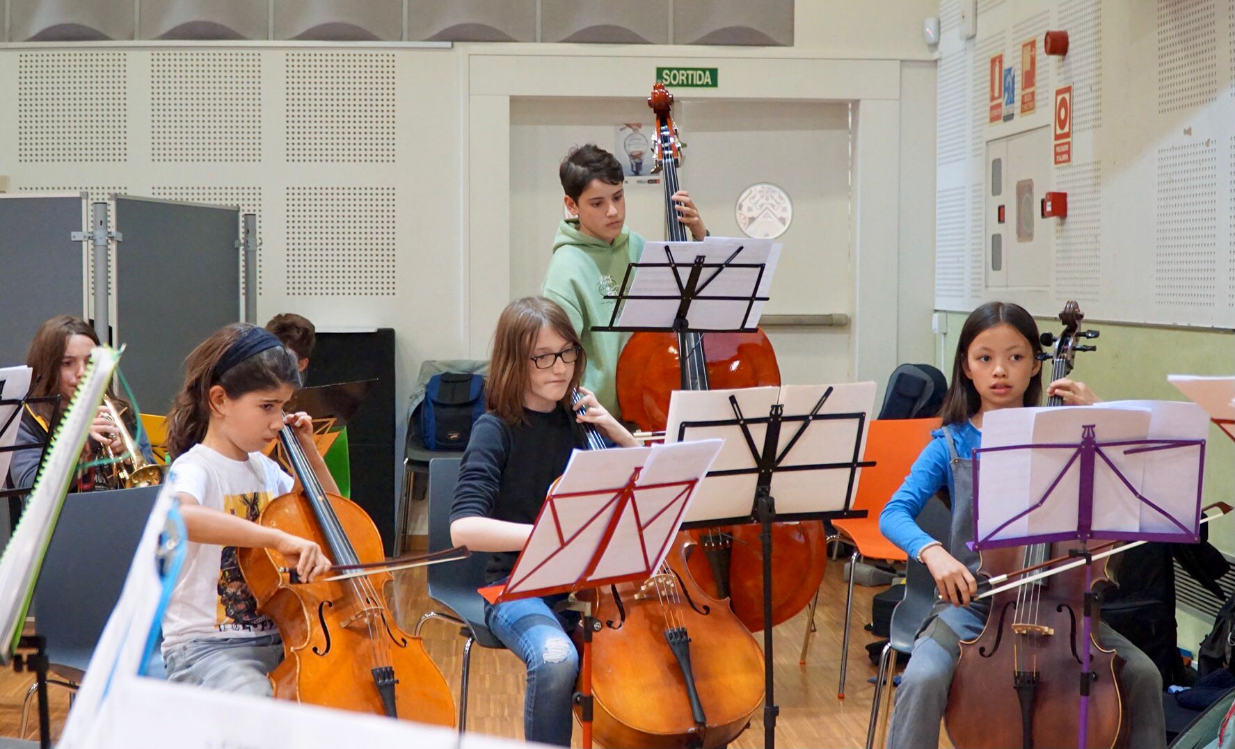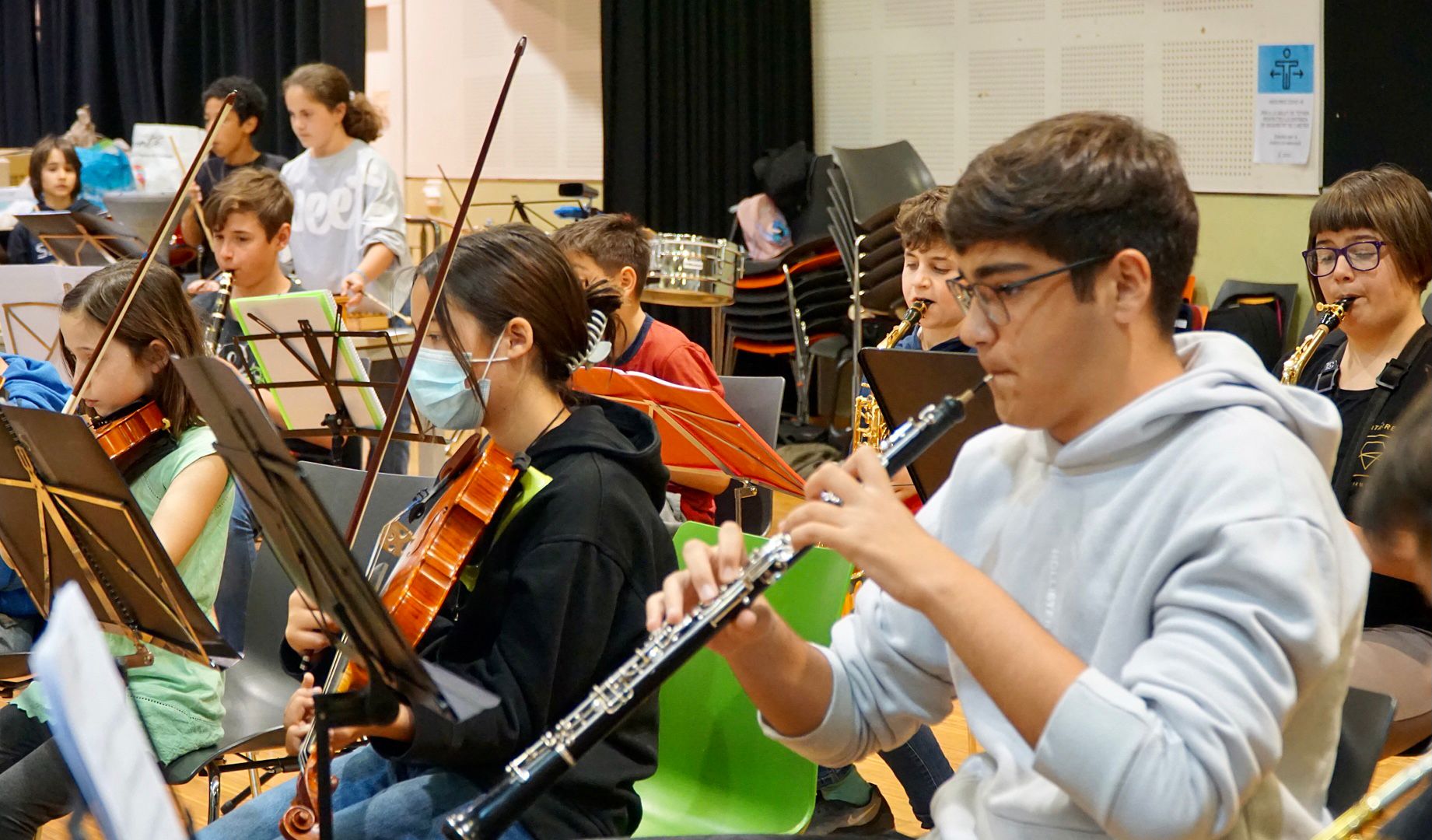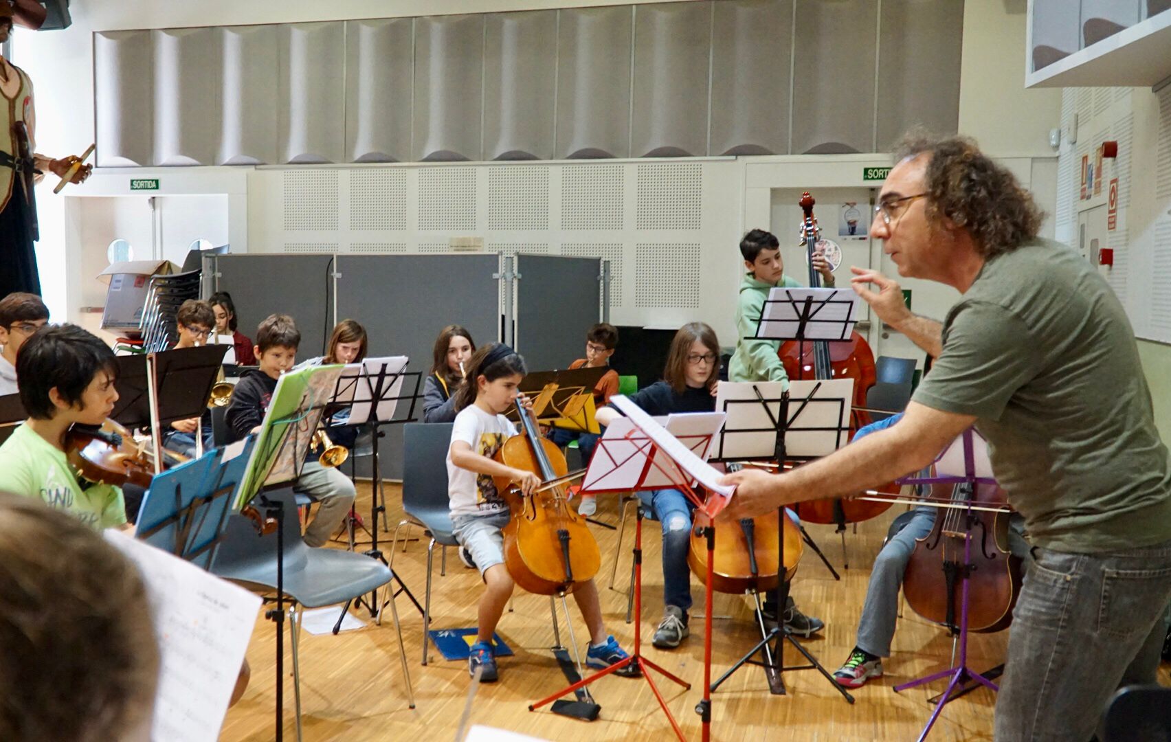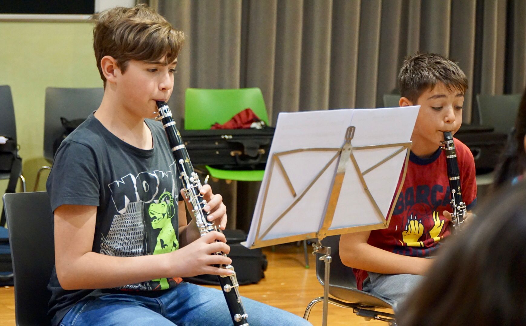45 músics a partir dels 10 anys han estat preparant la part instrumental de la cantata escolar LA FÀBRICA DE COLORS, i la Secció de Grans de l’OIB, formada per 16 instrumentistes de 13 a 18 anys, han assajat la cantata infantil EL MEU COS.